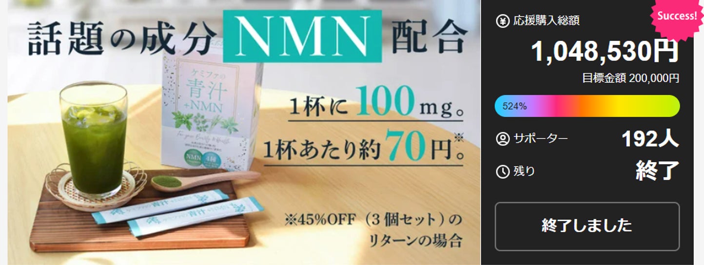 Makuakeにて目標金額達成率“驚異の524%”を記録した製薬会社の青汁『ケミファの青汁+NMN』が7月18日に一般販売開始!
