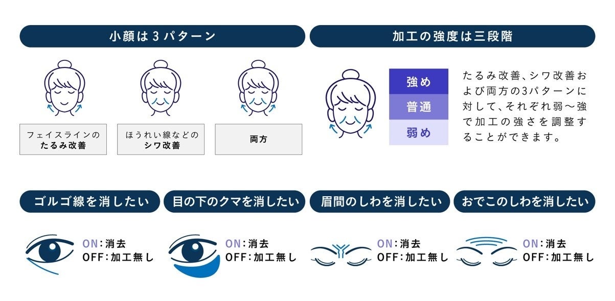 「糸リフト」「切らない目の下のクマ取り・目の下のたるみ取り」「ボツリヌストキシン注射」「ヒアルロン酸注射」の施術から、一度に複数のシミュレーションを行うことができます。 糸リフトはフェイスラインの「たるみ改善」、ほうれい線やマリオネットラインの「シワ改善」、またはその「両方」の3パターンに対して、それぞれリフトアップの強さ(弱め・普通・強め)を選択可能。切らない目の下のクマ取り・目の下のたるみ取りやボツリヌストキシン注射、ヒアルロン酸注射は施術の有無による変化のオンオフを切り替えて選択することで計144種類のシミュレーションを行うことができます。生成数は、大手美容外科が提供する来院せず使用可能なAIシミュレーターの中で最多です。