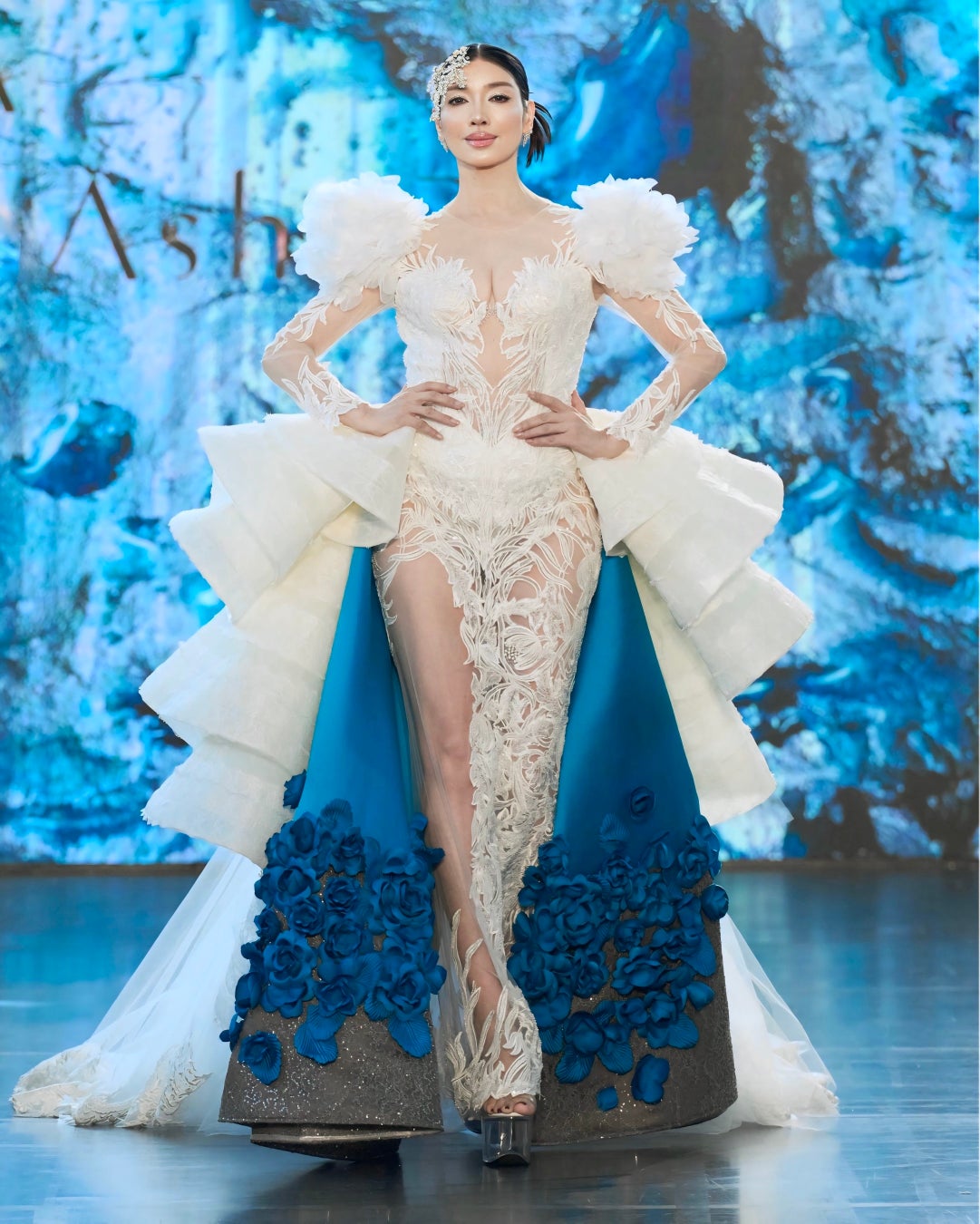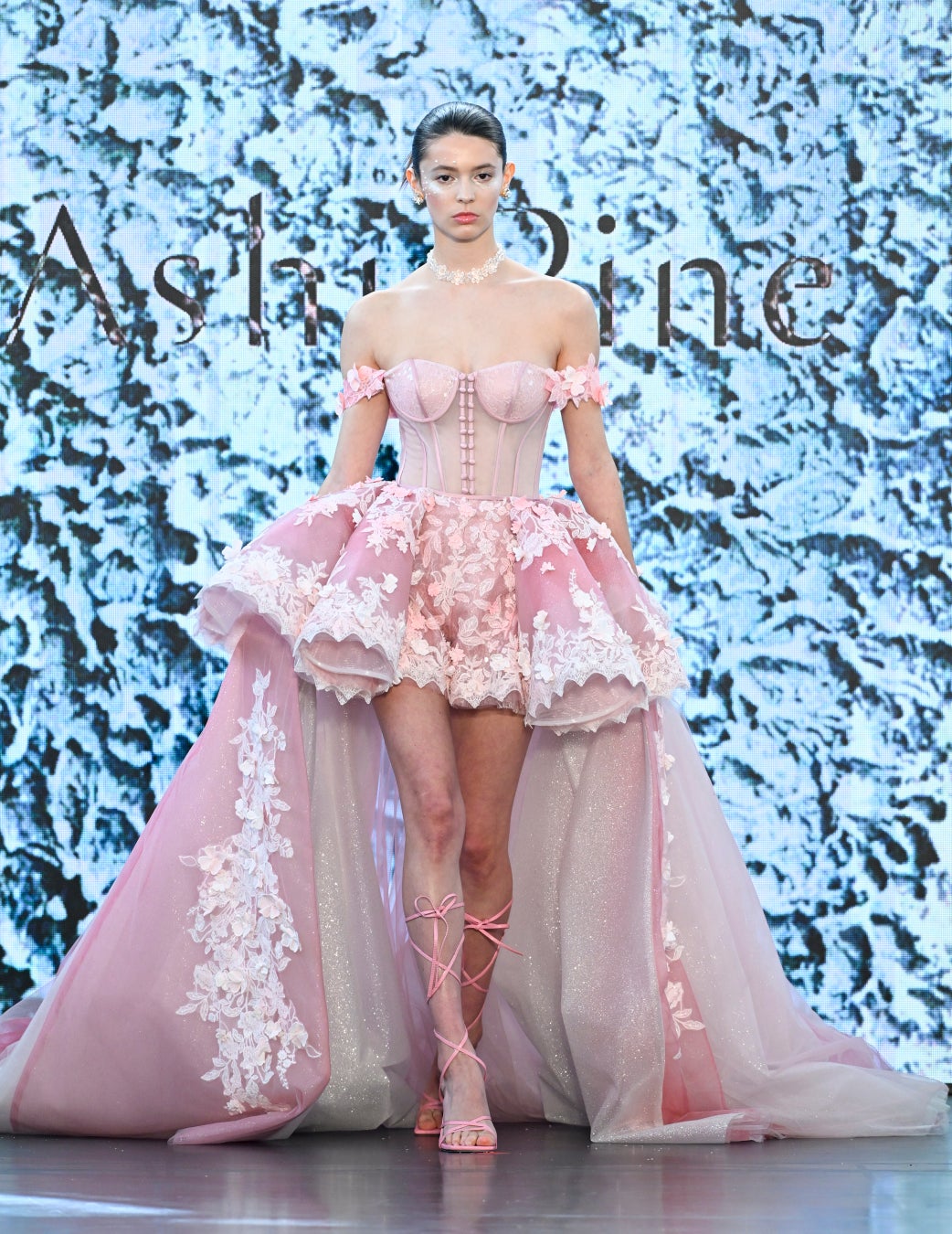 今回のショーでは、フォーシス アンド カンパニーが新たに立ち上げたオートクチュールブランド「AshuPine(アシュパイン)」が初披露されました。ブランド名を冠するデザイナーAshuPine本人も、ランウェイのフィナーレで登場し、ショーを締めくくりました。繊細なディテールと独創的なデザインが光るAshuPineのドレスは、会場の観客を魅了し、新ブランドへの期待が高まりました。