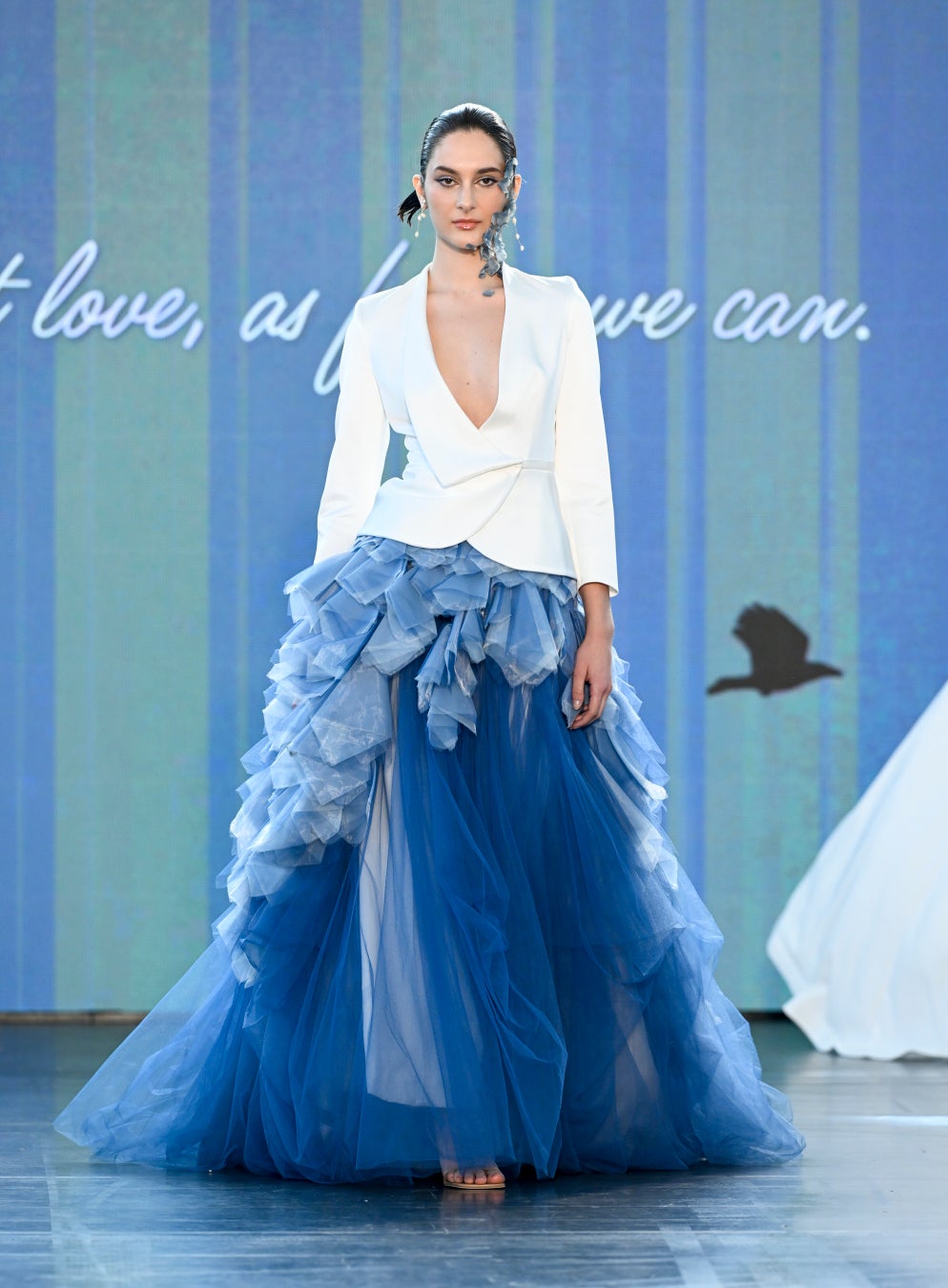 ショーのハイライトの一つとなったのは、モデル・タレントとして活躍するアン ミカさんの30年ぶりのランウェイ出演。鮮やかなブルーがアクセントとなった純白のドレスを身にまとい、圧倒的な存在感を放ちました。