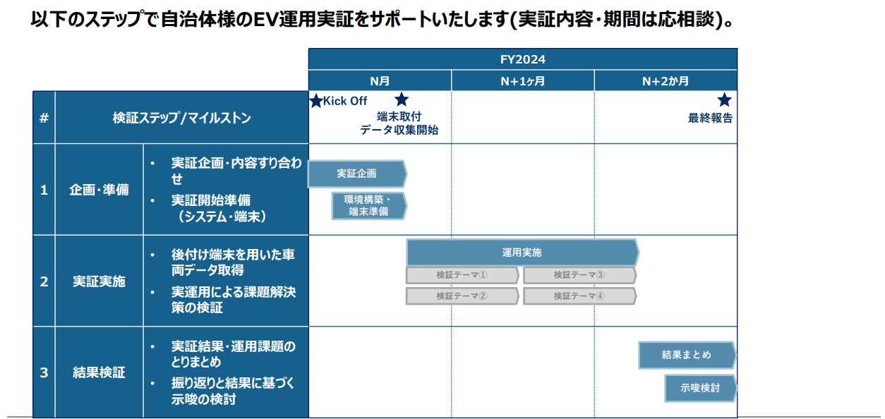本パッケージは自治体が抱える “EV車両を導入したが具体的にどのように活用すれば良いかが分からない” 等の課題に対して、e-mobilogを活用したクイックな実証を通じ、EV運用における車両データ活用の可能性を迅速に検証することを目的としてご活用いただけます。