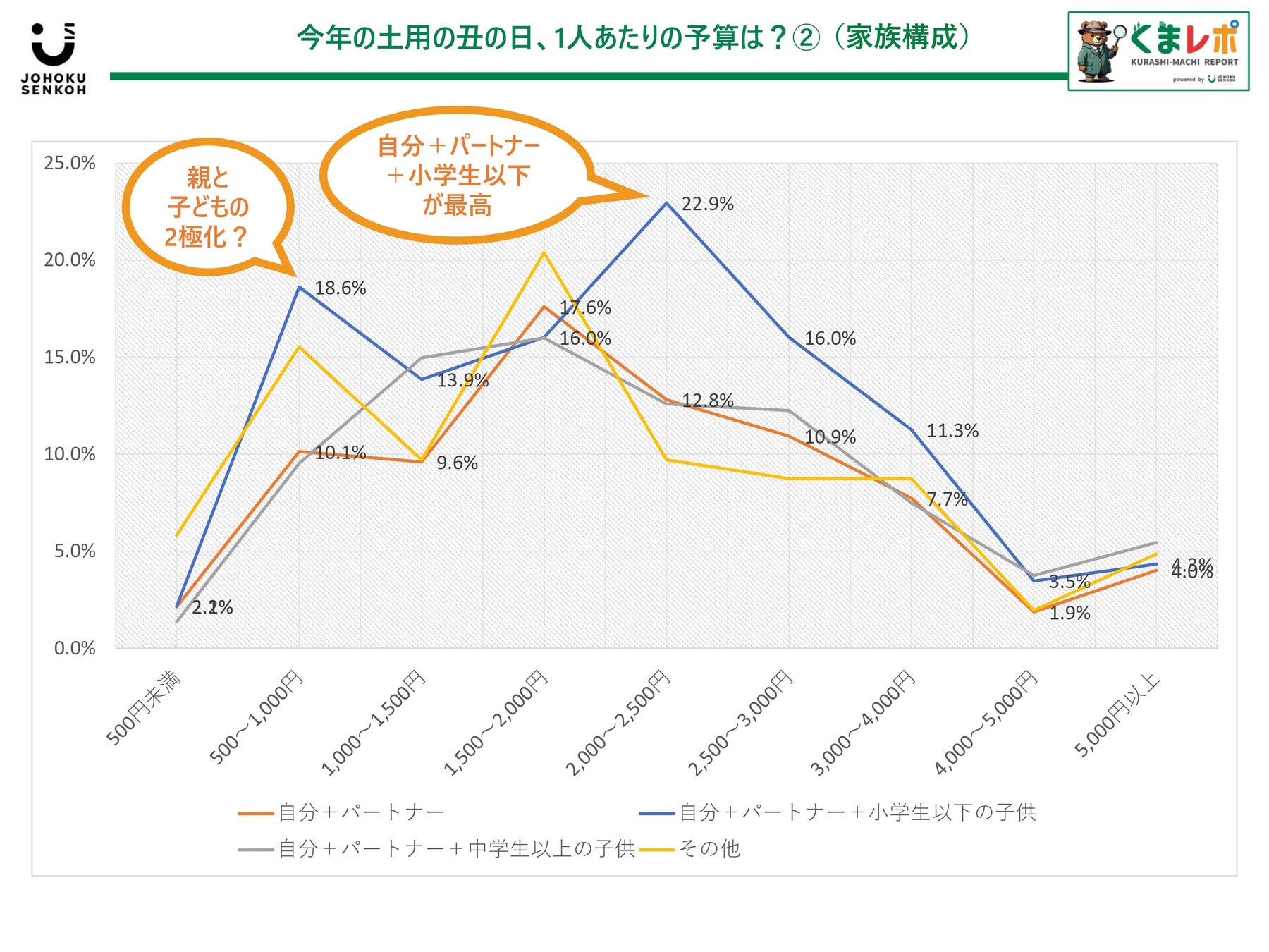 ・「2,000~2,500円未満」「500~1,000円未満」が共に多く、2極化を感じる結果に