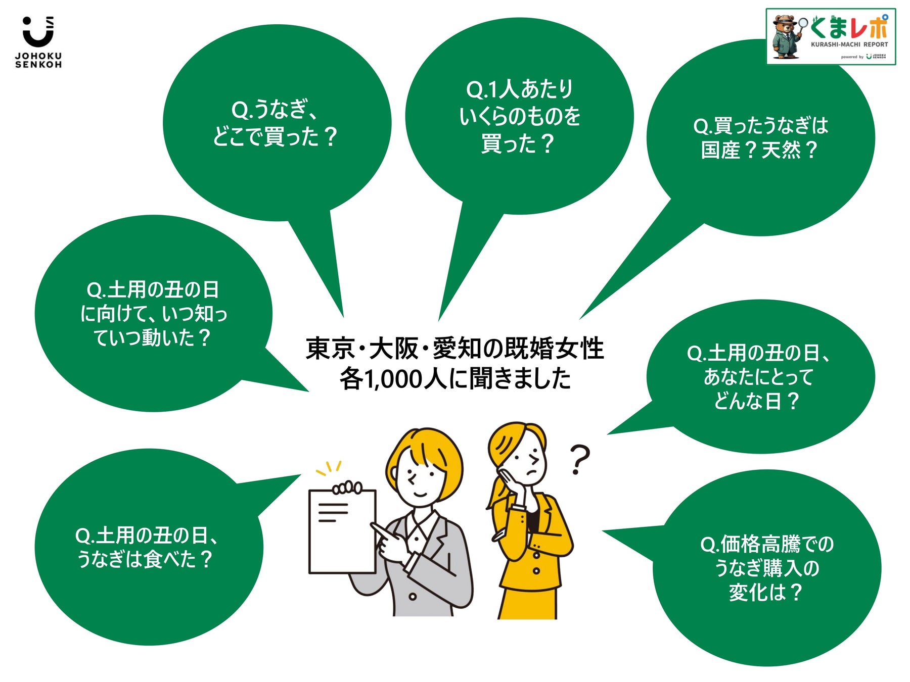 生活者の変化のキザシをとらえ、徹底的にエリアにこだわる"くらし・まちマーケティング®"を掲げる城北宣広株式会社(本社:大阪市北区、代表取締役社⻑:竹内俊文、以下「城北宣広」)は、2024年7月24日の「土用の丑の日」の実施状況を東京都・大阪府・愛知県在住の既婚女性各1,000名・計3,000名に生活者調査を実施。くらし・まちレポート"くまレポ"としてお届けする。
