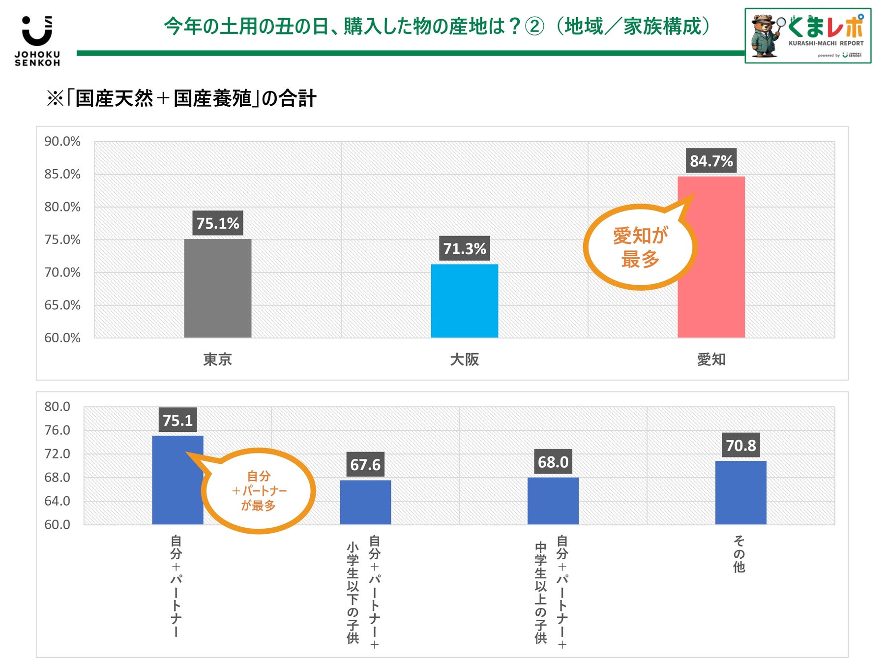 ・地域別では愛知県が国産84.7%、家族構成別では自分+パートナーが75.1%で最多