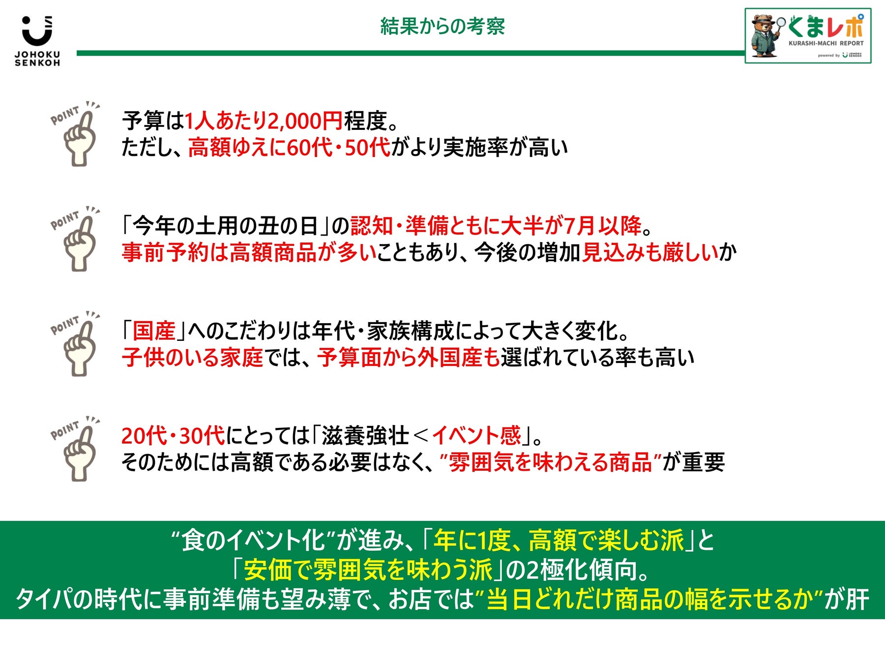 「人にあげずに楽しむバレンタイン」と同様に、元来の意味である滋養強壮などから、「うなぎを食べる非日常のイベント」への変化であり、そのイベント感のためには必ずしも高額商品である必要はないため幅広い生活者を取り込むには「うなぎを使った商品をどれだけ幅広く展開できるか」が肝になりそう。