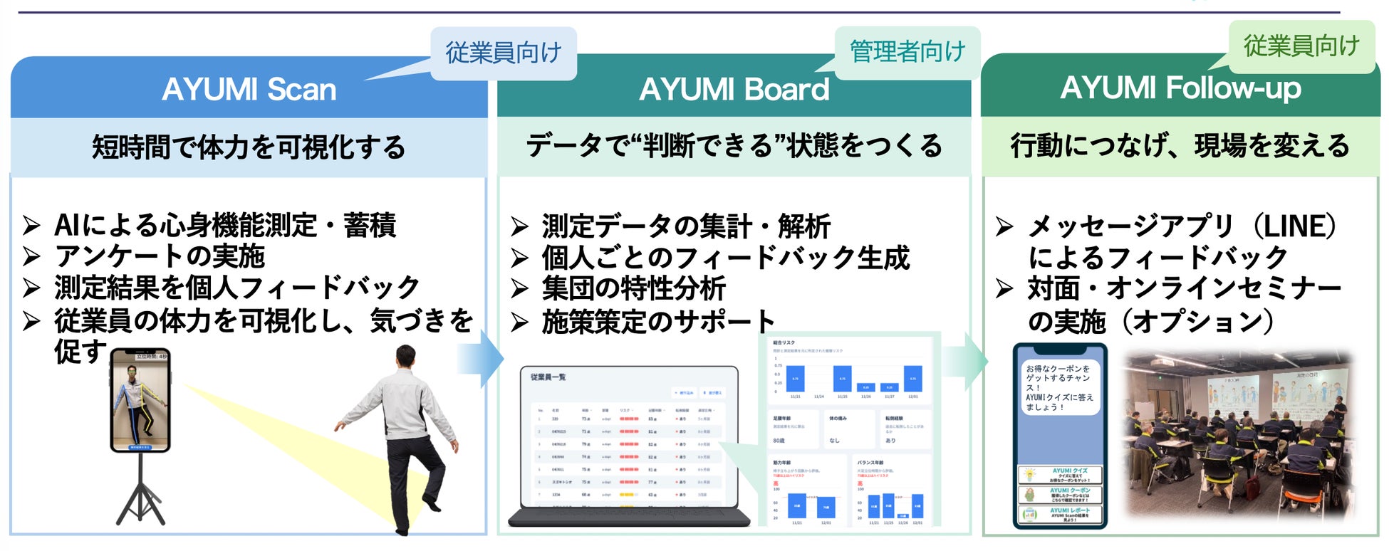 1.AIによる精密解析: 従業員の筋力やバランス力などをAIで解析。労災につながる心身機能を数値化し、本人も気づいていない「転倒」や「腰痛」などの労災リスクを可視化します。
