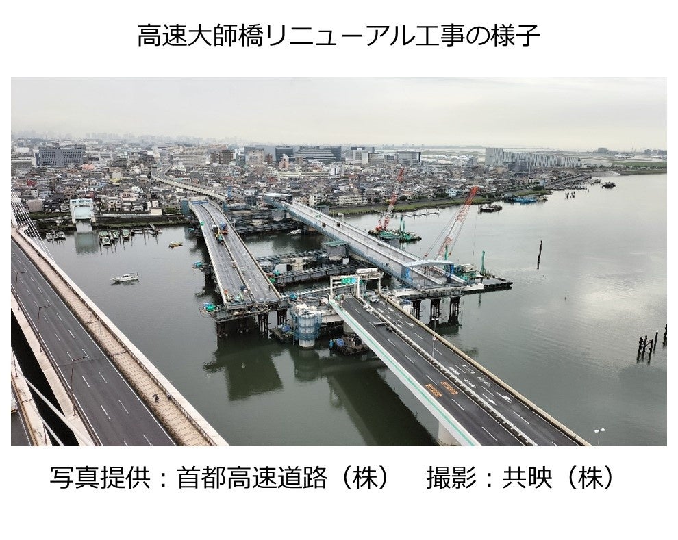 首都高速道路(首都高)は、開通から50年以上が経ち、開通当時と比較して交通量も大幅に増加しています。高速大師橋は、東京と神奈川の間の多摩川に架かり、1日8万台の交通量を支え続けてきましたが、これまでに1,200か所以上のき裂が見つかっておりました。これに対しては、きめ細やかな点検と適切な補修により、日々の安全・安心を確保していますが、構造物の長期的な安全性を確保するため、き裂が発生しにくく、長期の耐久性と維持管理性を備えた、より優れた構造へと高速大師橋を造り替える必要がありました。