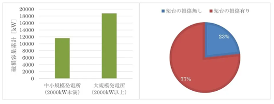 太陽光発電設備について、2018年度から2021年度の間に発生した破損事故は、計43件、被害総量は30MWを超え、住宅用ソーラーパネルの約7.5万世帯分の発電出力に相当します。