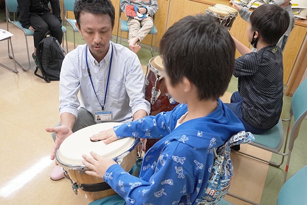 見たことがある楽器でも、実際に叩くのは初めてのお子さんが多く、最初は上手く音を出せませんでしたが、コツが掴めると見事に音を響かせられるようになっていました。