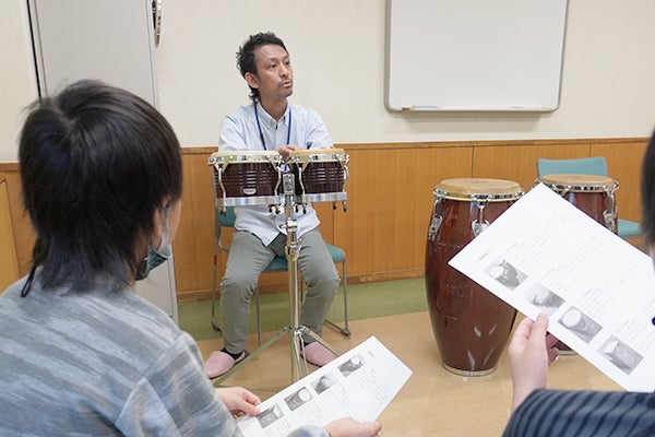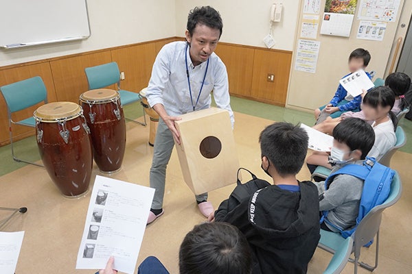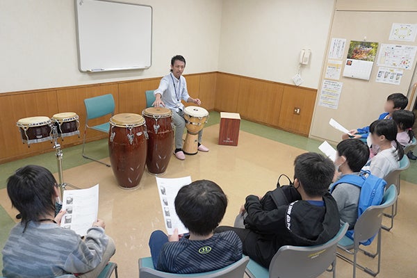 弊社が運営する音楽教室のドラム学科 「ドラム義塾」の創立者である西が、コンガやボンゴ、ジャンベやカホンなど、それぞれの楽器の特徴や、どの国で生まれたのかを説明。そのうえで、楽器それぞれがどんな音がするのか?演奏をして聴かせました。