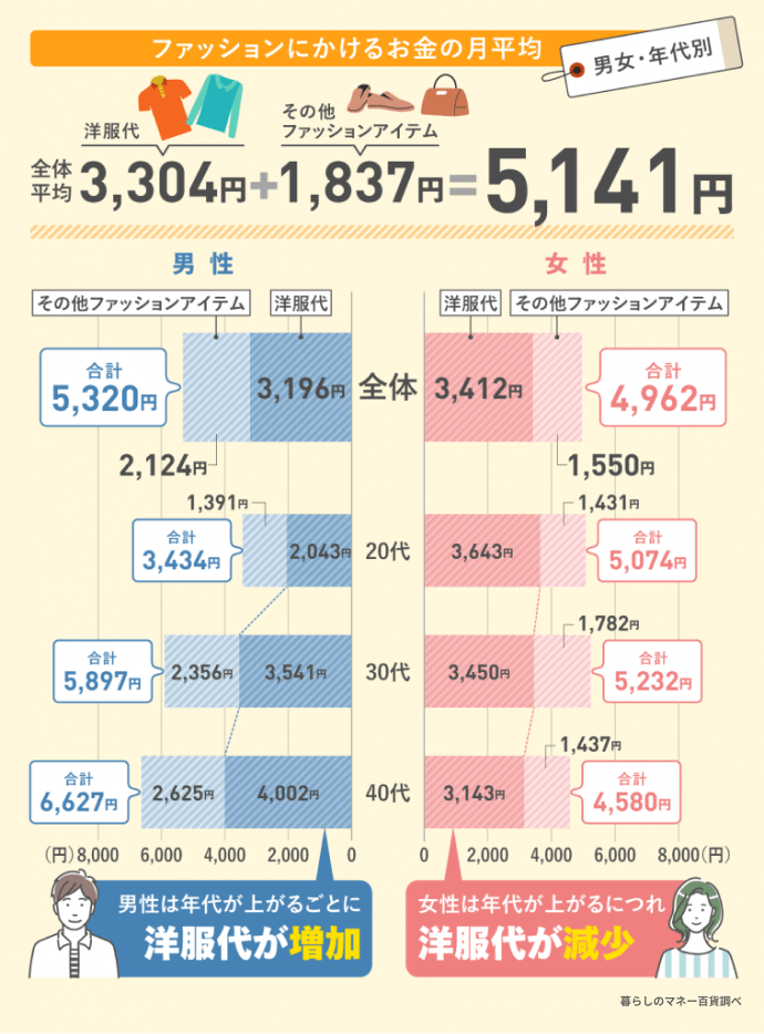 「洋服代などファッションにかけるお金は月平均5,141円!男女・年代別に1,200人調査」