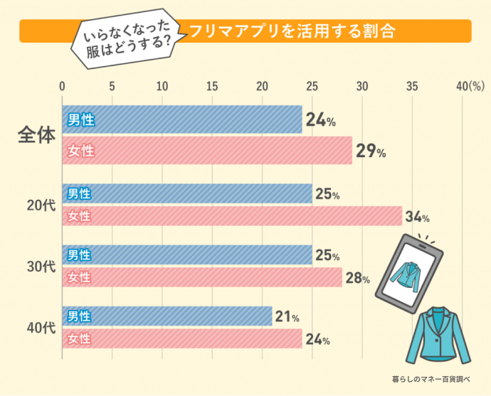 いらなくなった服を処分する際に、フリマアプリを利用する割合は、男性全体で24%、女性全体で29%と、女性の方がやや多め。それでも男性もおよそ4分の1の人がフリマアプリを活用していることがわかりました。