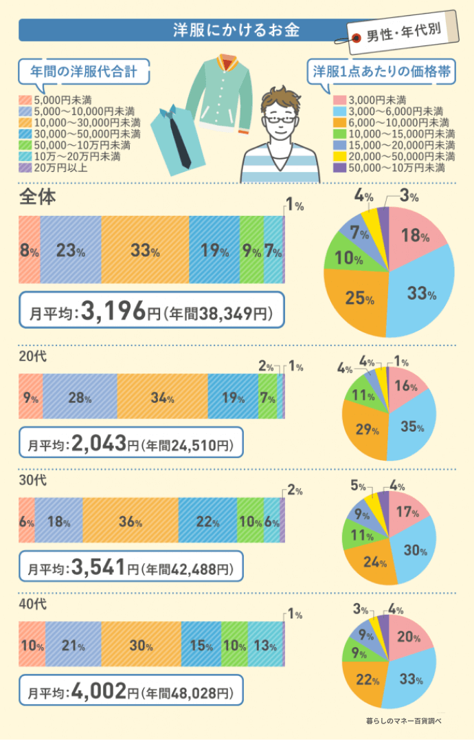 洋服代などファッションにかけるお金の平均について調査結果を発表!平均がもっとも高いのは40代男性という結果に