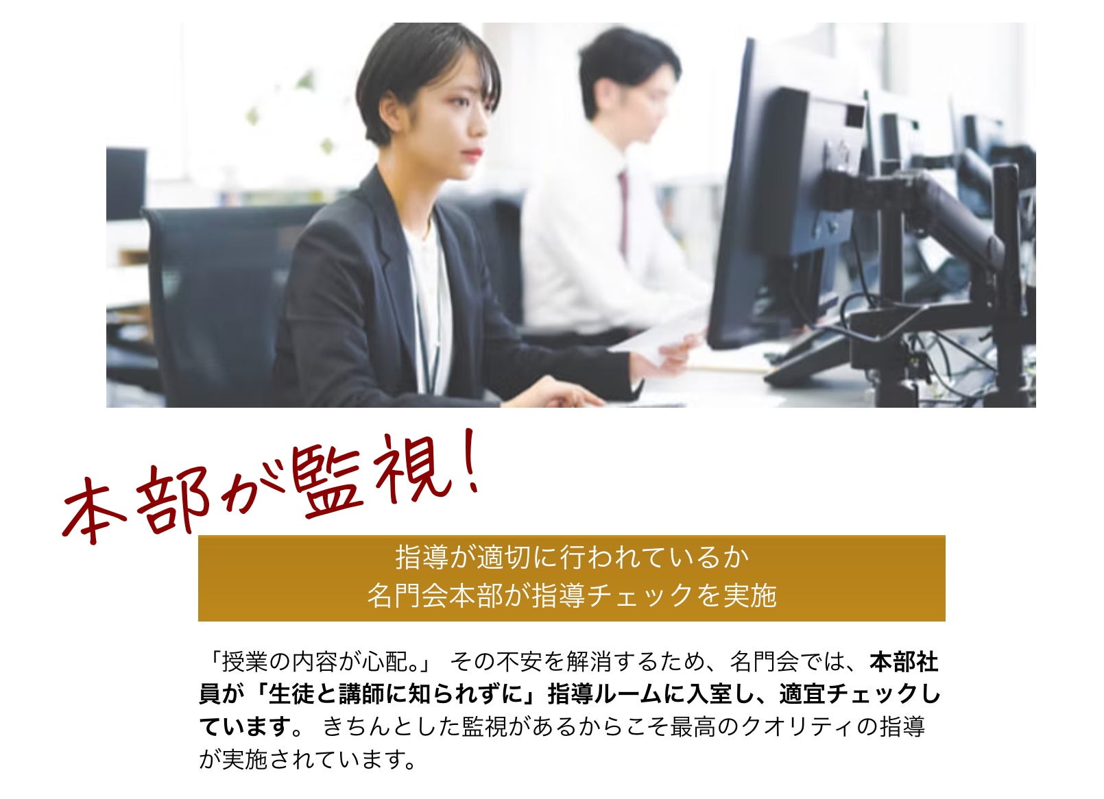 さらに、名門会本部による指導品質チェック体制も整備。必要に応じて授業の進行状況を確認し、指導の質を継続的に担保しています。