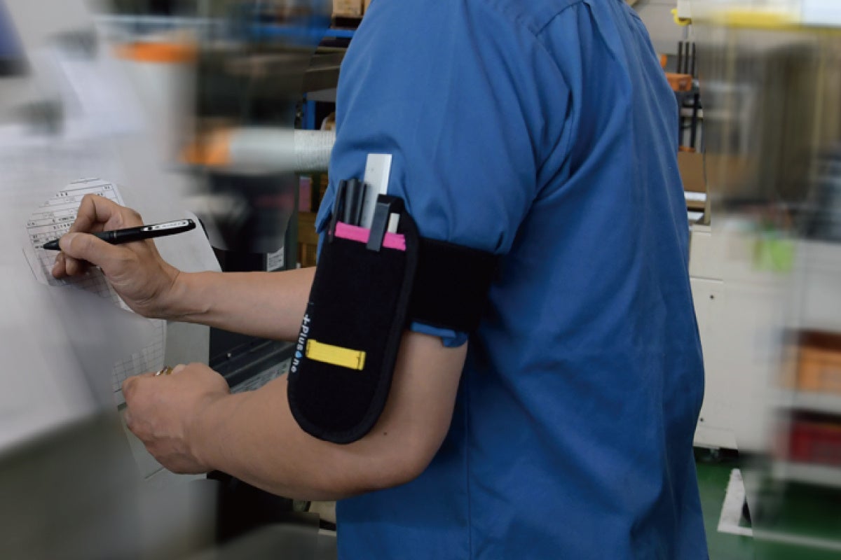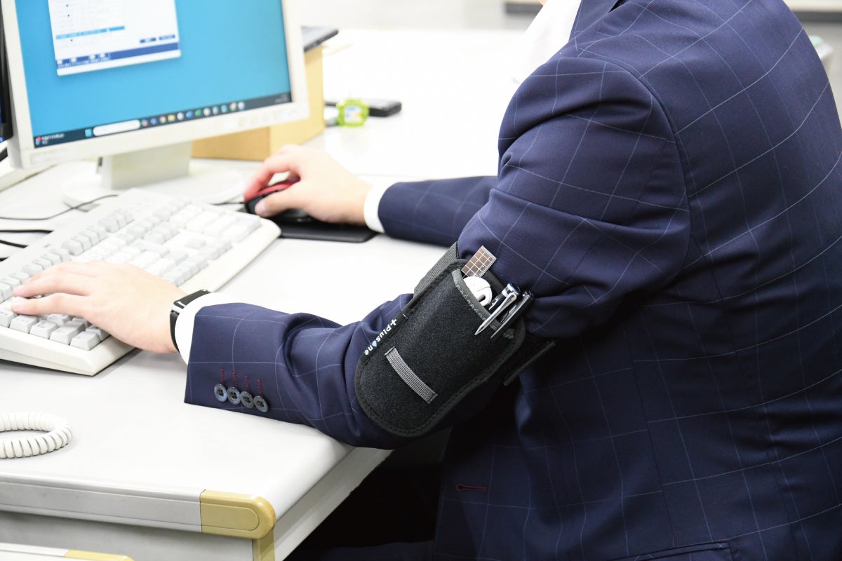 かがみになった際に落ちる。」「胸などにぶら下げるタイプは機械への巻き込みの恐れがあり使用できない。」など、これらの作業時あるあるを元に開発しました。アームバンド型の「作業着Like」は、ボー