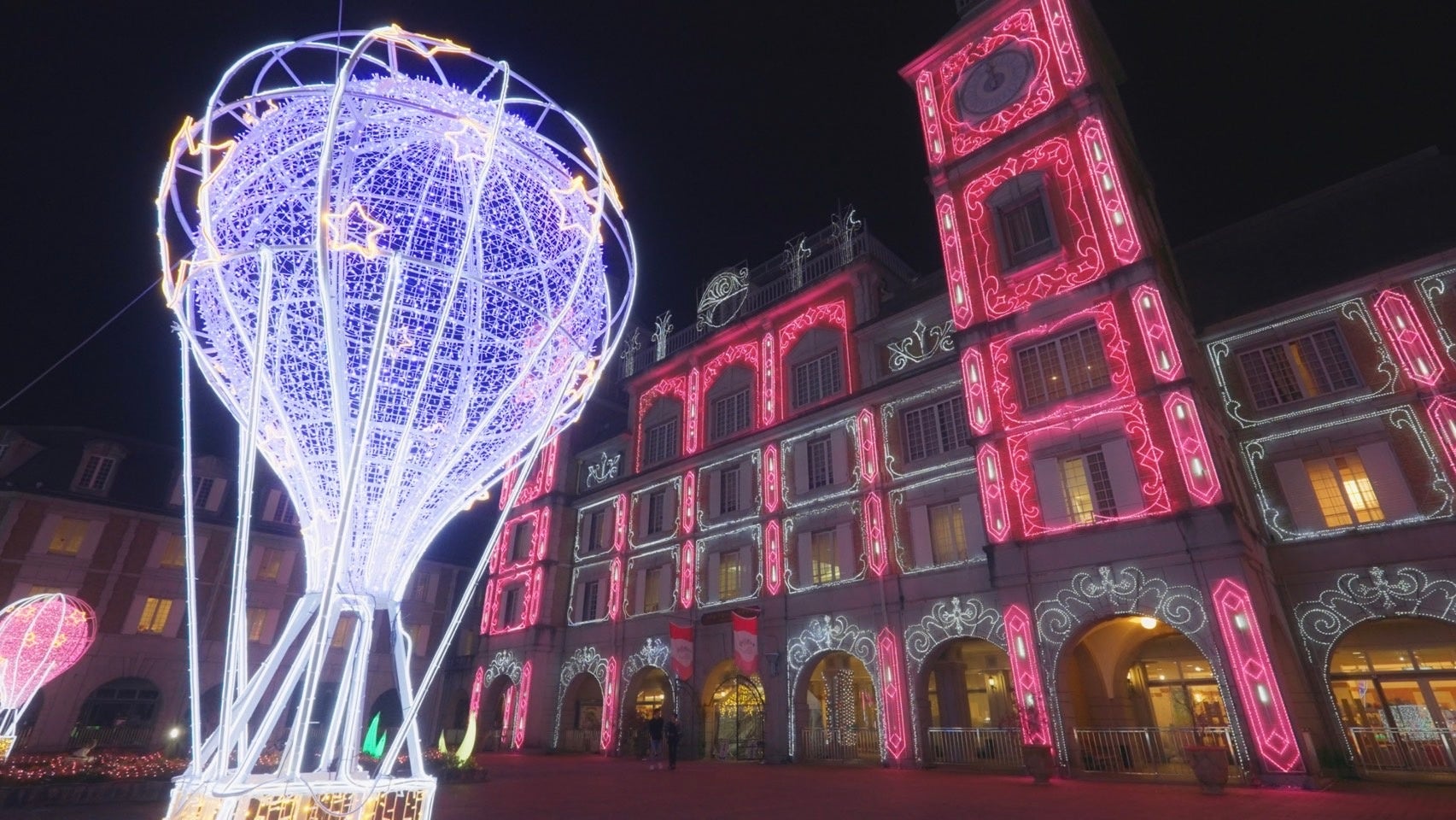 ホテル正面に現れる「ピンクパレス」と並び立つ新演出。煌めくピンクの宮殿と、クラシックな西洋建築を思わせる光の客船が並び立つ姿は、まるで港に停泊する豪華客船と異国の宮殿が向かい合うよう。非日常の旅へと出発する気分が味わえます。