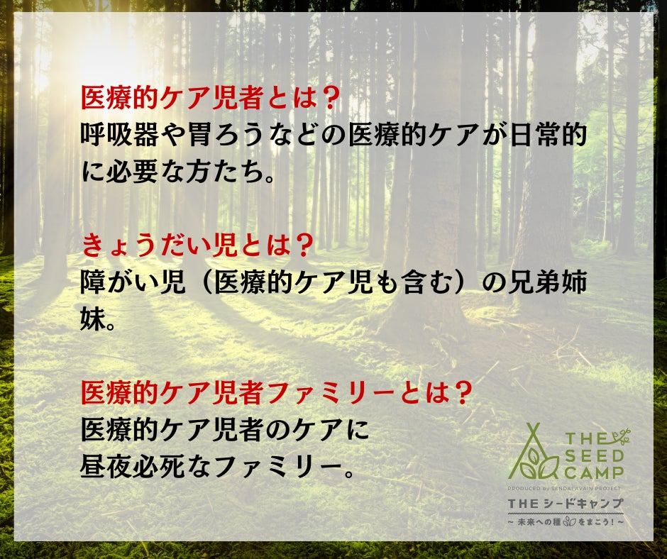 10月14日、秋晴れの仙台で、SWCあいの実主催『Theシードキャンプ~未来への種をまこう!~』が開催されました。キャンプには、医療的ケア児者ファミリー9組と、学生などのボランティアがご参加!