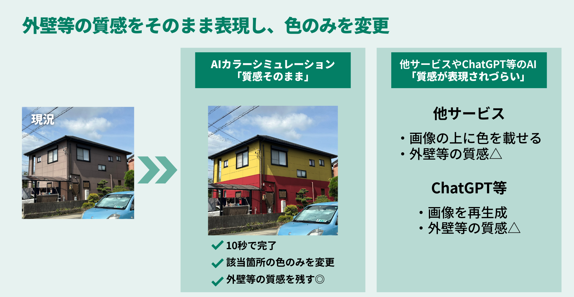 この度、本サービスの画像処理技術の新規性・独自性が認められ、特許を取得いたしました。他サービスや汎用的なAIによるカラーシミュレーションと比較し、付帯部を除く画像検出の精度や、外壁等の質感を残して色だけを塗り替える技術の新規性が評価されたことにより、特許取得に至りました。他サービスのカラーシミュレーションでは、画像の上に色のレイヤーを重ねるような仕組みにより、外壁等の質感が残りにくい傾向があり、また汎用的な画像生成AIでは、画像が再生成される特性上、元の建物の質感やリアリティを維持した表現が難しい場合があります。そのため、いずれも仕上がりのリアリティに課題が残る傾向がありました。この度特許を取得した技術は、手作業でシミュレーション画像を作成する手間を削減しながら、従来のカラーシミュレーションサービスやAIが抱える「外壁等の質感のリアルさが欠ける」という欠点を解決します。