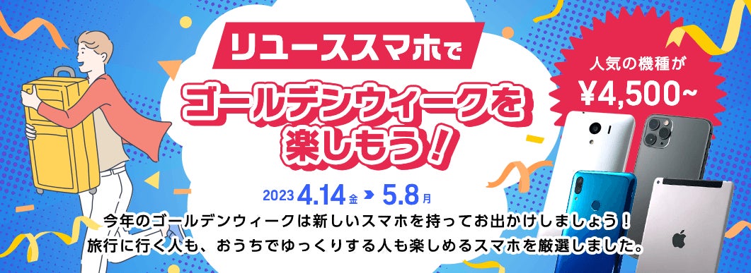 リユースモバイル事業を展開する日本テレホン株式会社(大阪市北区、代表取締役社長:有馬知英、証券コード:9425、以下「当社」)は、中古スマホのオンラインショップ「エコたん」(https://ecotan-store.com/)において、GWキャンペーンを開催いたします。「リユーススマホでゴールデンウィークを楽しもう!」をテーマに、旅行に行く人もおうちでゆっくりする人も楽しめるスマホを厳選しております。