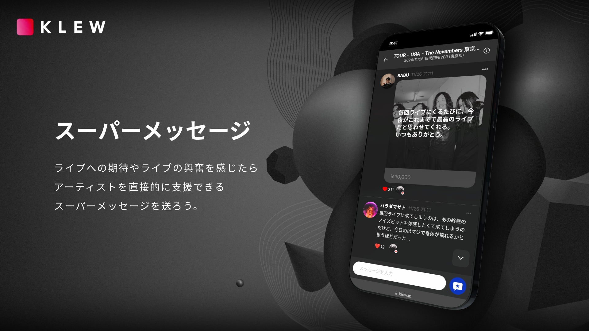 KLEWは、同一公演のライブチケットを保有するファン同士やファンと出演するアーティストだけがデジタル上でコミュニケーションを取れる国内初(※1)のプラットフォームです。