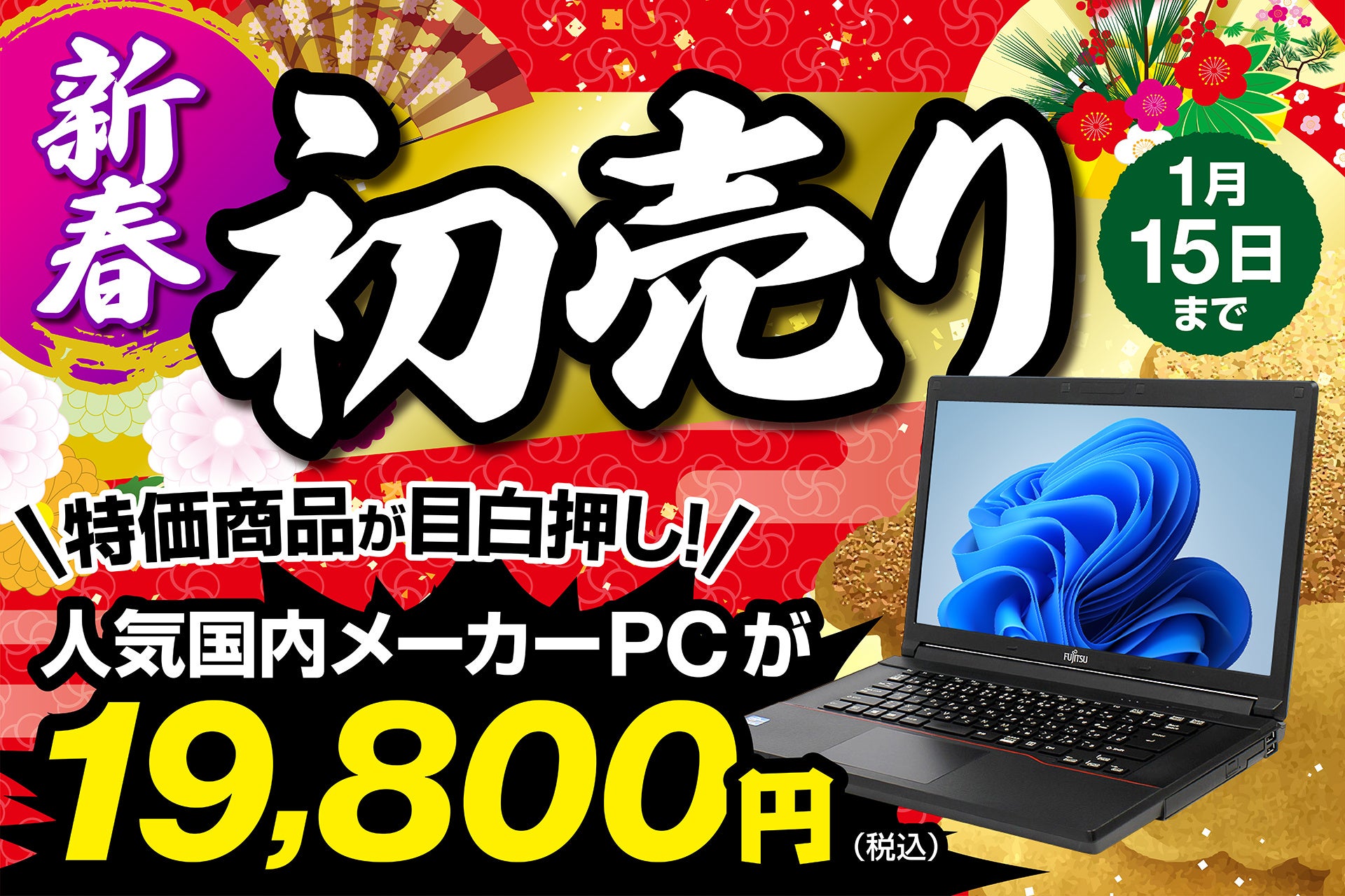 株式会社メディエイター(所在地:福岡県中央区)が運営する、中古パソコン販売を主力とするパソコン市場では、2023年1月1日(日)から2023年1月15日(日)まで、「2023年 初売り」を行います。人気の国内メーカー製パソコンなど、期間限定のお年玉大特価でご提供いたします。パソコン市場ECサイトの他、全国25店舗でも開催いたします。各店舗においては実際の商品をご覧いただけます。