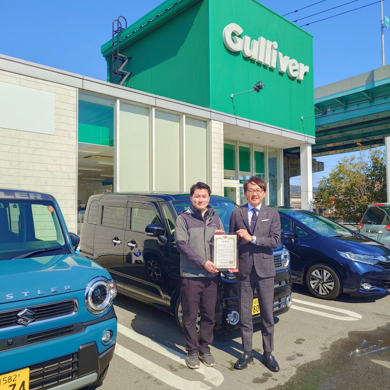 2025年2月25日には、福岡県宇美町より、企業版ふるさと納税制度を活用した寄附を行ったことに伴い感謝状贈呈式が開催されました。当日は、ガリバー太宰府インター店にて安川町長からストアマネージャーの並木氏に感謝状が贈呈されました。