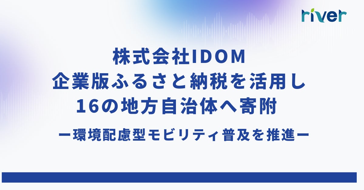 株式会社カルティブ(本社:神奈川県横浜市、代表取締役:池田 清)は、運営する企業版ふるさと納税を活用した地域課題解決プラットフォーム「river(リバー)」にて、株式会社IDOM(本社 東京都千代田区、代表取締役社長 羽鳥 由宇介)が、企業版ふるさと納税を活用した循環型社会応援プロジェクトを組成し、16の地方公共団体に対し寄付を行いましたことを報告いたします。