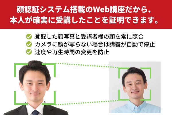 CICの《顔認証付き・Web講座》では、顔認証システムを導入しているため、いつでもどこでも手軽にPCやスマホから受講することが可能です。最短で受講ができるので、急を要する受講の場合も安心です。