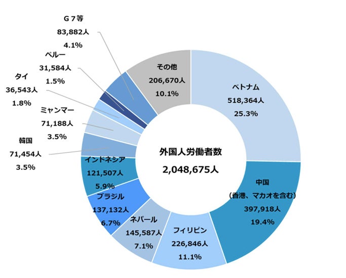 厚生労働省調査結果によると、国籍別の外国人労働者数は、ベトナムが最も多く518,364 人(外国人労働者数全体の25.3%)。その次に、中国397,918人、フィリピン226,846人の順です。