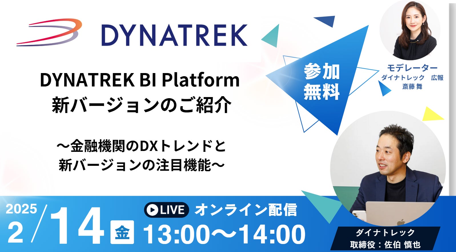 株式会社ダイナトレック(本社:東京都港区、代表取締役:佐伯 譲二、以下「ダイナトレック」)は、日本全国の約30の金融機関でのデータ統合・データ活用プロジェクトを展開しております。この度、ダイナトレックでは、地域金融機関のDX推進を加速する「DYNATREK BI Platform」の新バージョンをご紹介するオンラインセミナーを開催いたします。