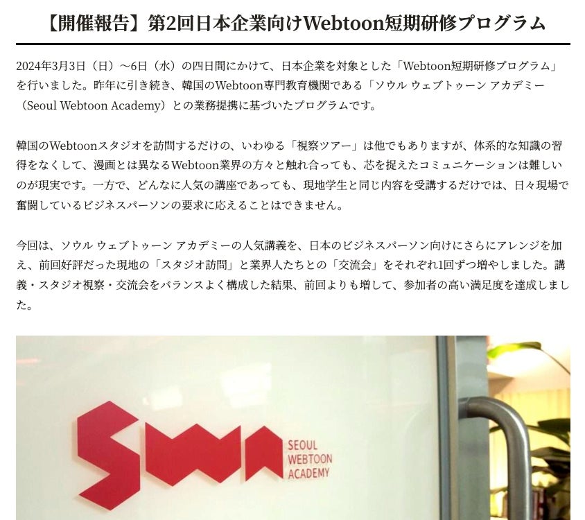 Culture Weaver合同会社(本社:東京都豊島区、代表:平柳竜樹、以下「Culture Weaver」)は、2024年9月28日から10月1日の4日間、日本企業を対象としたWebtoon短期研修プログラムをソウルで開催します。本プログラムは、韓国の縦スクロールコミック専門教育機関「ソウル・ウェブトゥーン・アカデミー(Seoul Webtoon Academy)」との業務提携に基づくプログラムで、最新の業界動向を学び、グローバルなビジネスチャンスを探る絶好の機会です。