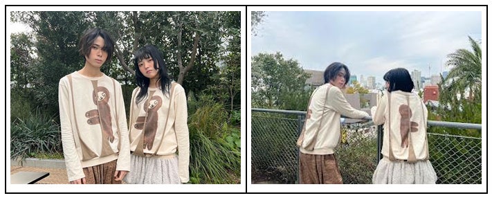アーティストのKANさんが好きだという「なまけもの」。原画にある”棒にぶら下がっている”様子もディテールで再現しています。モデルは「とてもかわいいし、着心地が最高。」とコメント。着心地の良さにも抜かりがない点も重要なポイントです。