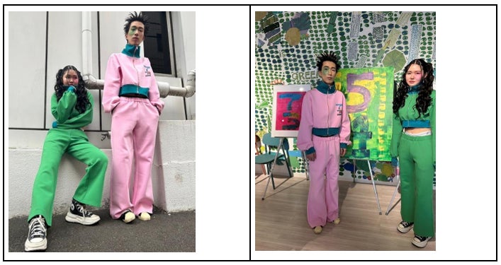 通常は女性がピンク、男性がグリーンとなりがちなところを、逆の色彩を採用。ニットでありながら着心地のいいセットアップに仕立てた本作品は、モデルたちからも好評を得ていました。トレンドにもマッチするアイテムは、若年層の興味をひく一着となっています。