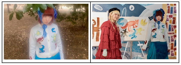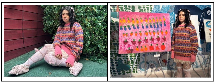 原画のカラフルで色鮮やかで、ポップな世界観を見事にニットに落とし込んだ作品。複雑で繊細な仕立ては、認証企業の匠の技が光る一着と言えるでしょう。アーティスト自身もかわいいものが好きだといい、「かわいいです。嬉しい。」とコメントしていました。