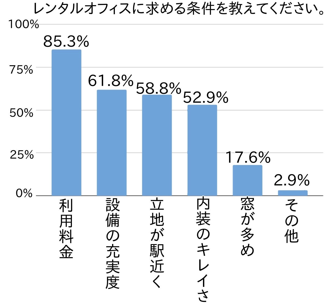 まずは「設備の充実度(61.8%)」を重視する方が多く、「内装のきれいさ(52.9%)」「窓が多め(17.6%)」というオフィス内の環境が重視される傾向にありました。