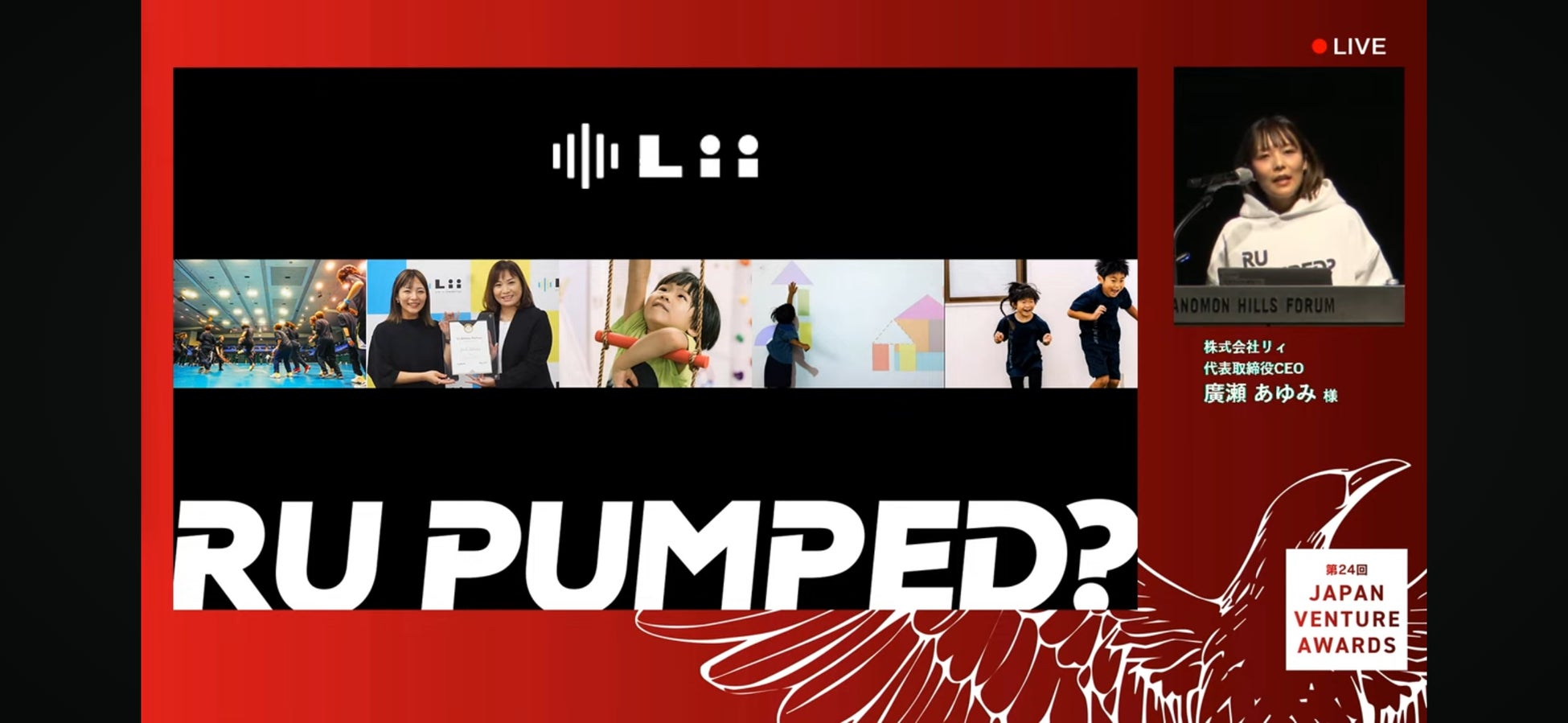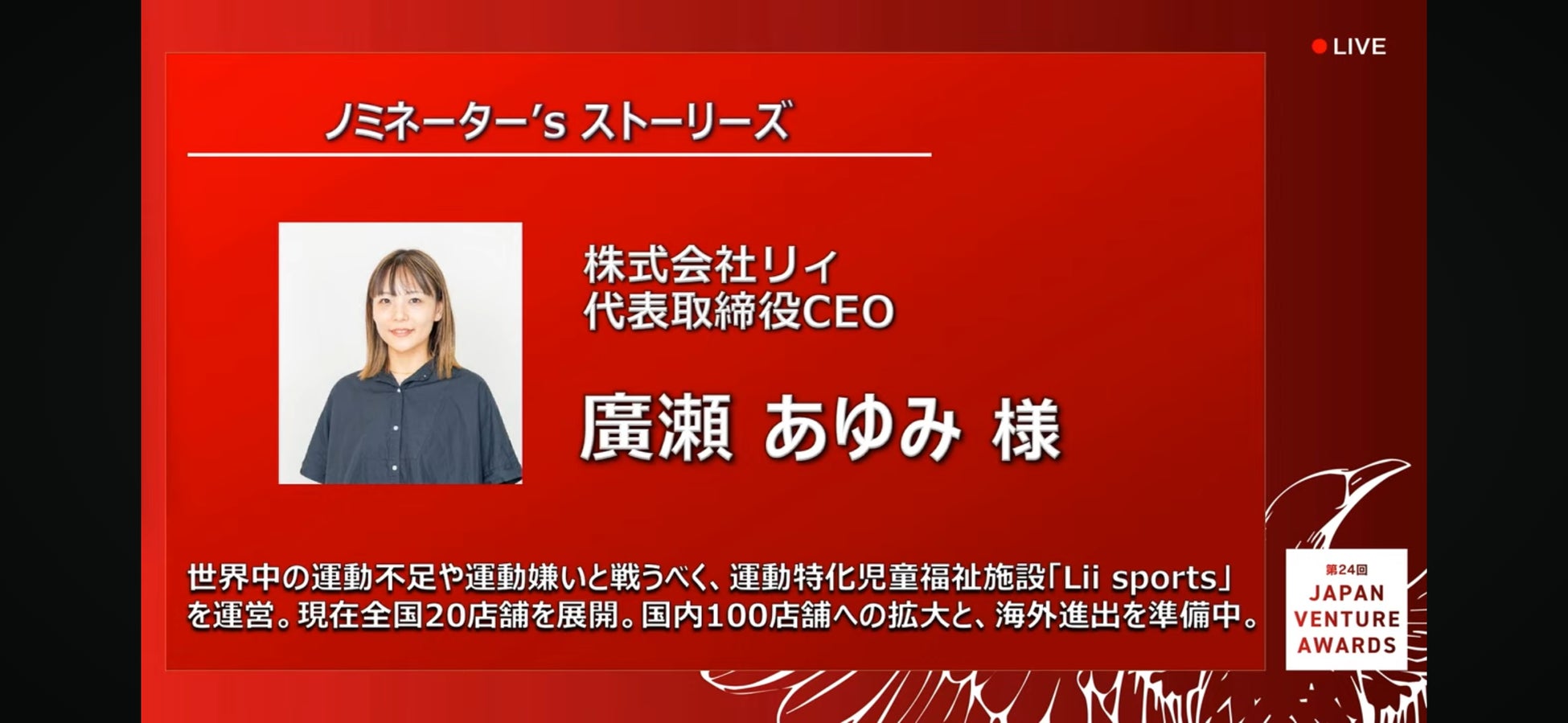 デジタルスポーツ支援を用い、発達に課題のある子どもを対象とした運動サービス「Lii sports studio」を運営する株式会社リィ(愛知県名古屋市、以下「当社」)の代表取締役・廣瀬あゆみは、独立行政法人中小企業基盤整備機構(以下「中小機構」)が主催する「第24回 Japan Venture Awards」にて、地域貢献特別賞を受賞したことをお知らせします。