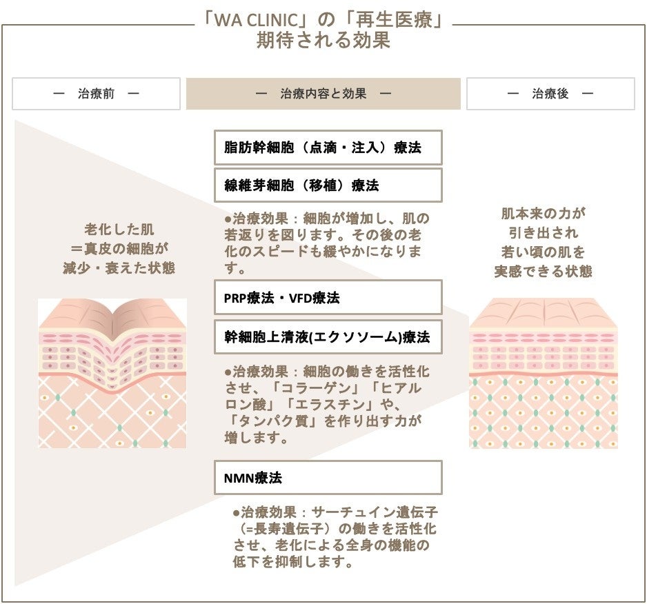 WA CLINICの治療メニューは、大きく「再生医療」と「美容皮膚科」の2種に分類しています。長期的視点をもった肌管理の考え方をもとに、2つを組み合わせた最適な治療プランを患者様に合わせてご提案します。肌の真皮の根本治療となる再生医療を組み合わせることにより、従来の美容皮膚科の治療効果も高まります。