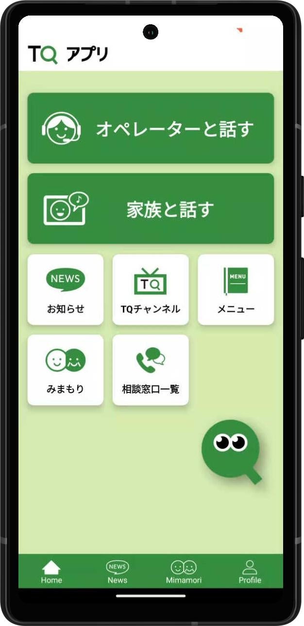 シンプル操作で使いやすい、シニアの方も簡単に使える専用オペレーター付タブレットです。利用者の方は設定やWi-Fiなどの準備の必要がなく、届いた日からタブレットを利用できます。タブレットに不慣れな方でも、操作サポートは専用オペレーターが丁寧にご案内(※2)。家族とのビデオ通話や、オンラインレッスンなどの動画鑑賞、健康相談や詐欺相談のような日常のあらゆるご相談など、インターネットを通じたサービスを安心かつ簡単に利用できます。また、スマホアプリと連携することで簡単に親子間で繋がることができます。利用者家族も嬉しい様々なサービスが充実しております。「ボタンひとつで家族に繋がる新しい親孝行のかたち」をTQタブレットで実現しました。(※2 導入サポートは2回まで無料)