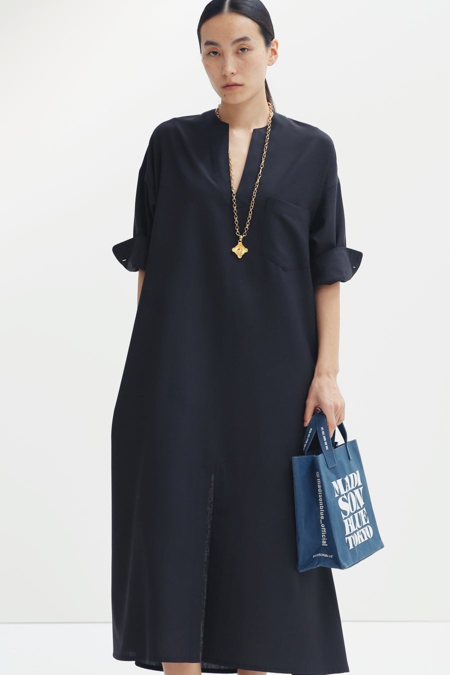 不動の人気を誇る "NO COLLAR VOLUME OP" に、待望のBLACKが加わりました。2026年春夏より展開するウール&ポリエステル混紡素材を採用し、さらに軽さと通気性をプラス。ボリュームのあるシルエットでありながら、素材の持つ自然なドレープによって上質な落ち感を兼ね備え、軽やかな印象で着用いただけます。シーンを選ばず対応できる汎用性の高さも、このワンピースが長く愛される理由のひとつです