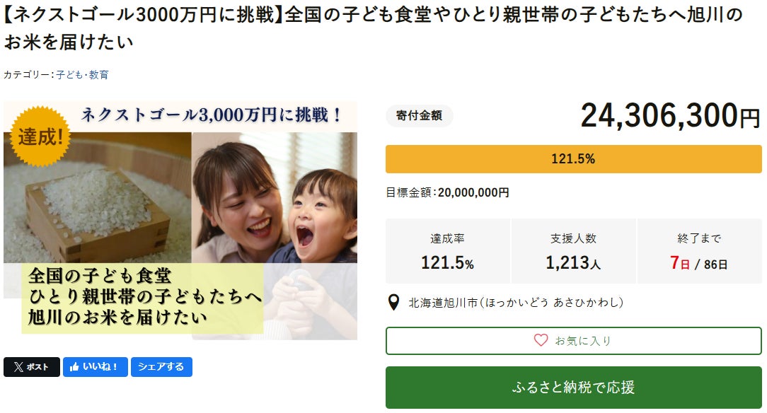 北海道旭川市 × “こどもふるさと便” 全国のこども食堂やひとり親支援へのお米寄贈事業において、ふるさと納税型クラウドファンディングで2,000万円のゴール達成