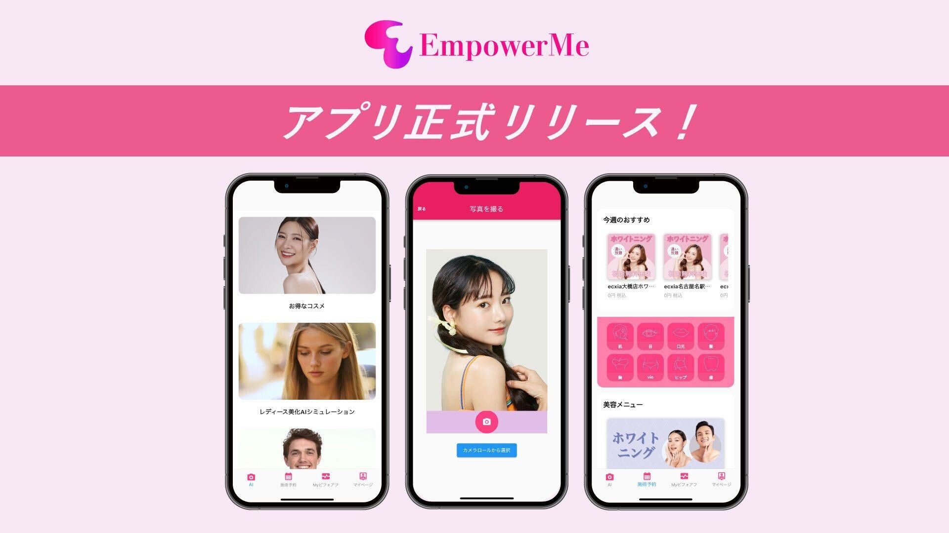 【エンパワーミー】は、国内特許取得済のエイジングケア・美容医療・施術予約アプリです。美容医療技術から誕生した自分の”未来の顔”をシミュレーションできるのが特徴です。AI技術でユーザー様の顔をゼロから生成することができ、ユーザー様のお悩みに合ったクリニックを選んで、特別メニューとポイント還元で予約することができます。また、AIシミュレーションだけでなく、エイジングケアコスメの購入も可能です。