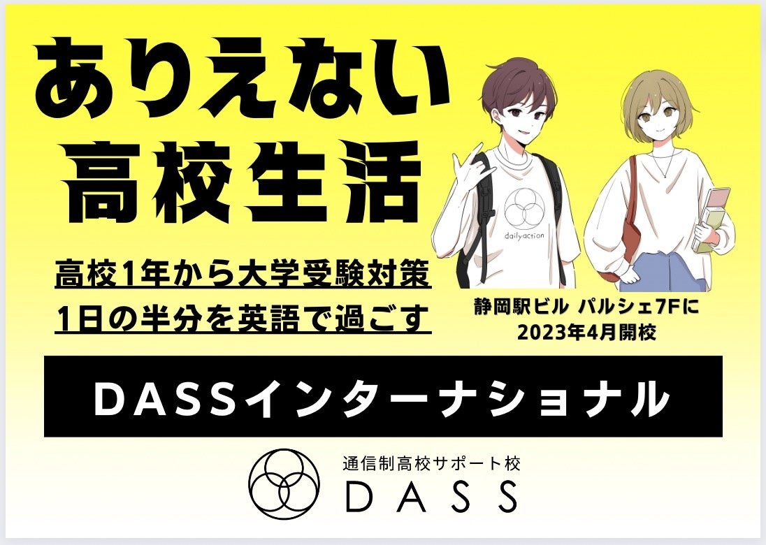 DASSは、インターナショナルスクールと進学校のハイブリッド校をコンセプトとした、静岡市の通信制高校サポート校 。午前の授業は全て大学受験対策、午後の授業は外国人講師の指導の下、オール英語で実施。3年間で受験力と英語力を徹底的に強化する、全国的にも非常に珍しいカリキュラムを提供している。