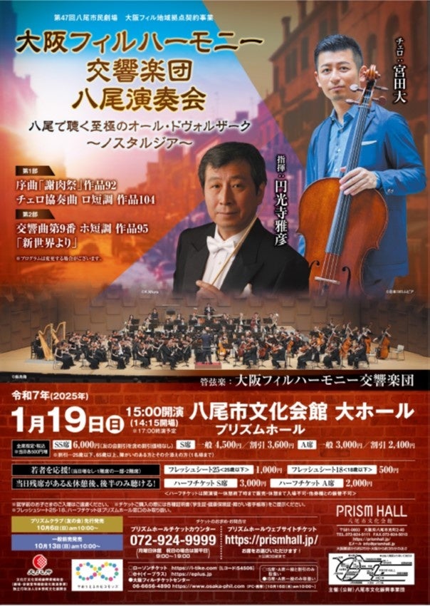 八尾市文化会館プリズムホール(大阪府八尾市)にて毎年恒例の大阪フィルハーモニー交響楽団八尾演奏会が今年度も来年2025年1月19日(日)に開催決定!