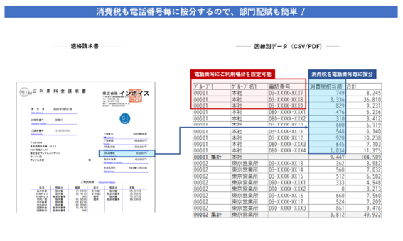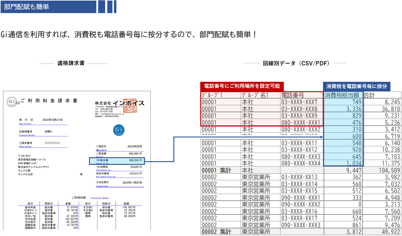 Gi通信が提供する請求内訳データを活用すれば、請求書で1回の消費税計算をした後に電話番号毎に消費税相当額を按分して表記するので、電話番号毎の部門配賦が効率的に行えます。