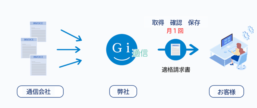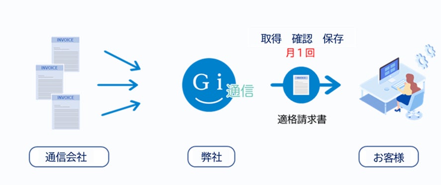 Gi通信が、複数の通信会社の請求をまとめてお支払いし、「適格請求書」を発行します。