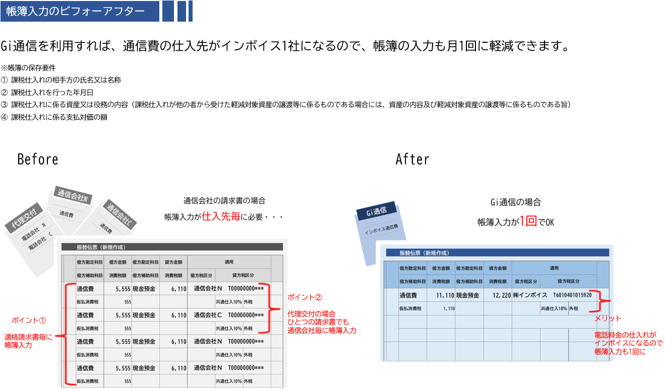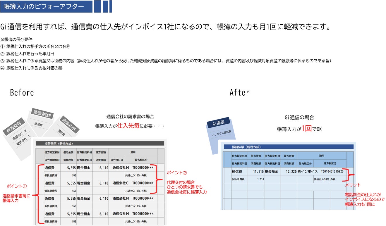 Gi通信なら、電話料金の仕入先が全て弊社になる為、代理交付された適格請求書や複数の通信会社を利用していても、帳簿の入力が1回に軽減できます。