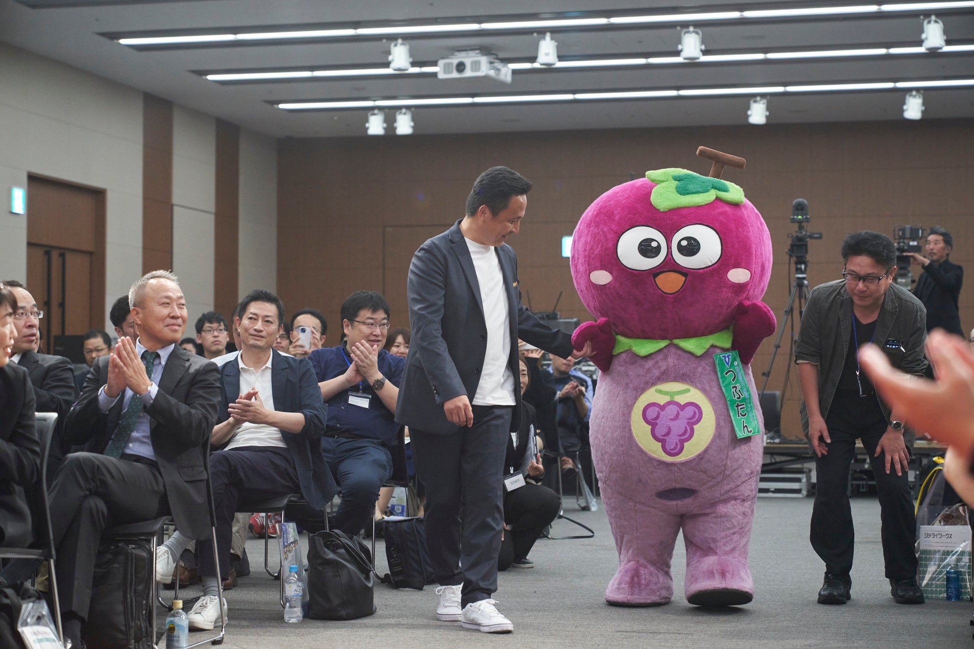 記念品贈呈での登壇は羽曳野市ご当地キャラクター「つぶたん」も一緒に登壇。会場が和やかな雰囲気に包まれました。