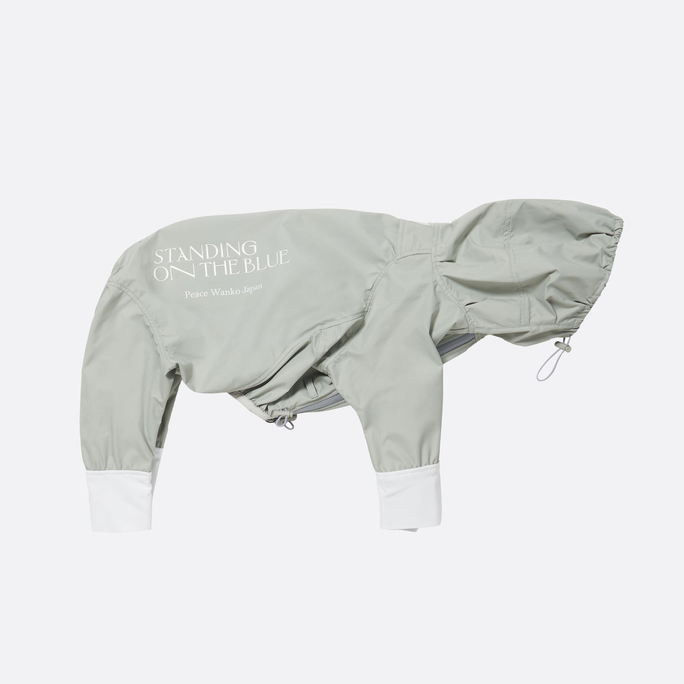 STANDING ON THE BLUEのアイテムの中でも大人気のレインスーツ「Ultra Rain Suit」からコラボレーションカラーとしてグレーを発売します。STANDING ON THE BLUEらしいスタイリッシュなグレーにこだわり、ブランドロゴとともにピースワンコ・ジャパンの名前入り。ボディは特殊ポリウレタンフィルムを使用し、防水・防風・透湿を兼ね備えた機能性抜群のレインスーツです。