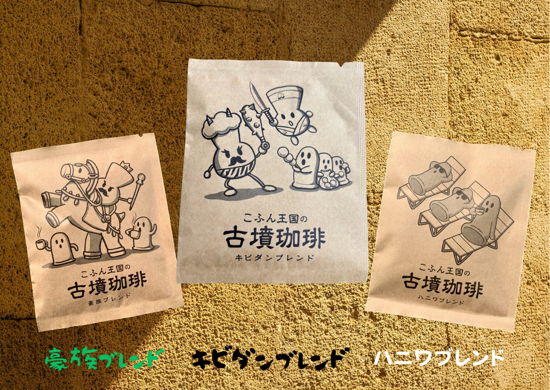 商品は従来の「豪族ブレンド」「ハニワブレンド」に新商品「キビダンブレンド」を加えた三種の神味(フレーバー)として、コーヒー好きの方にも満足いただけるラインナップです。