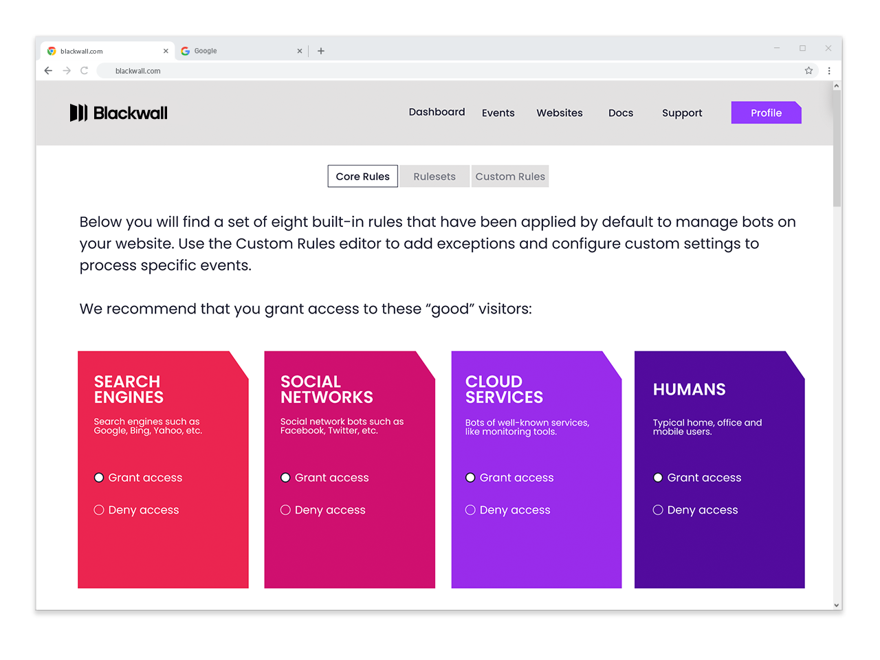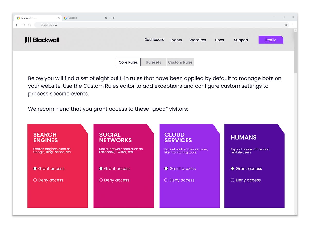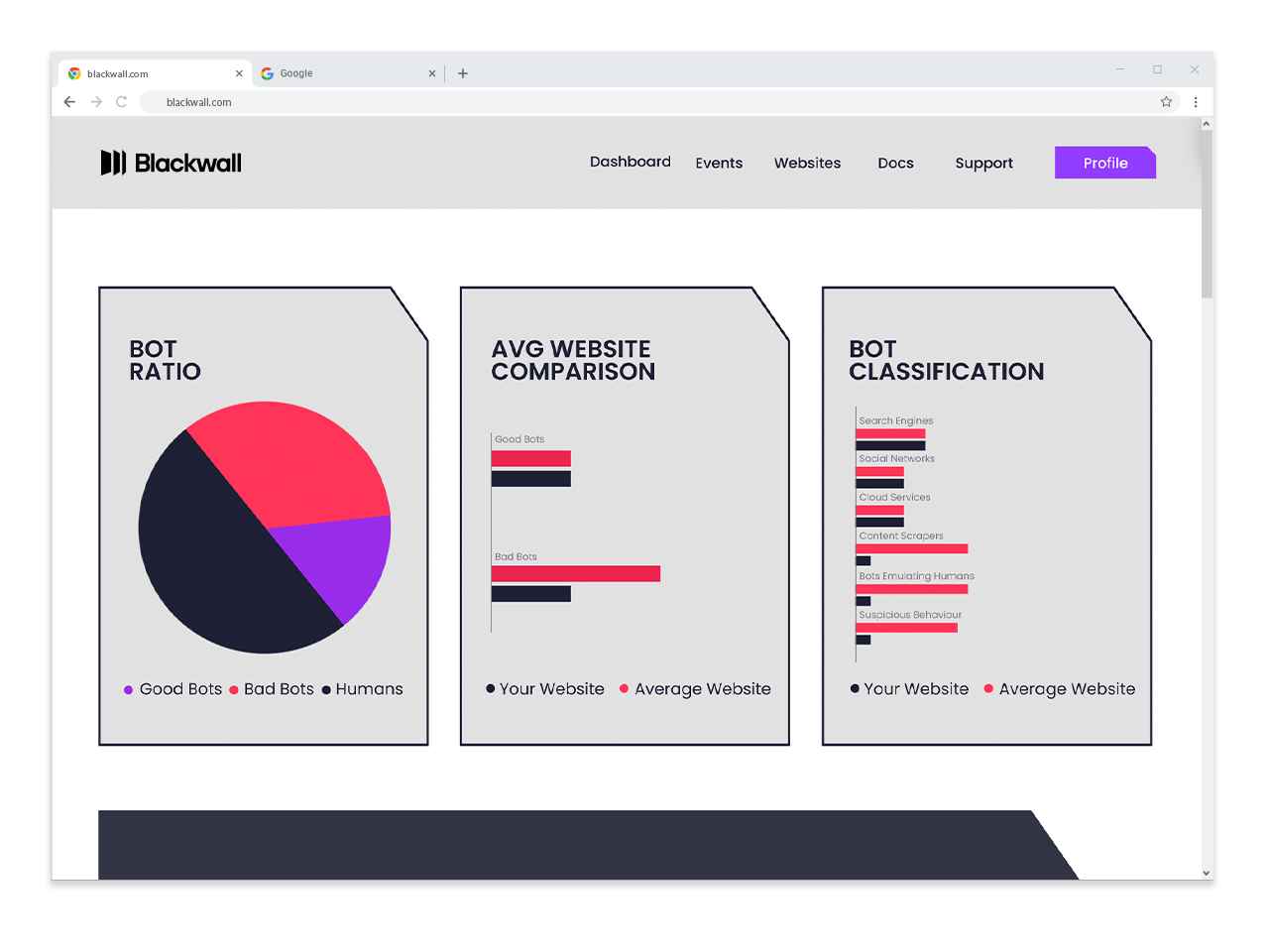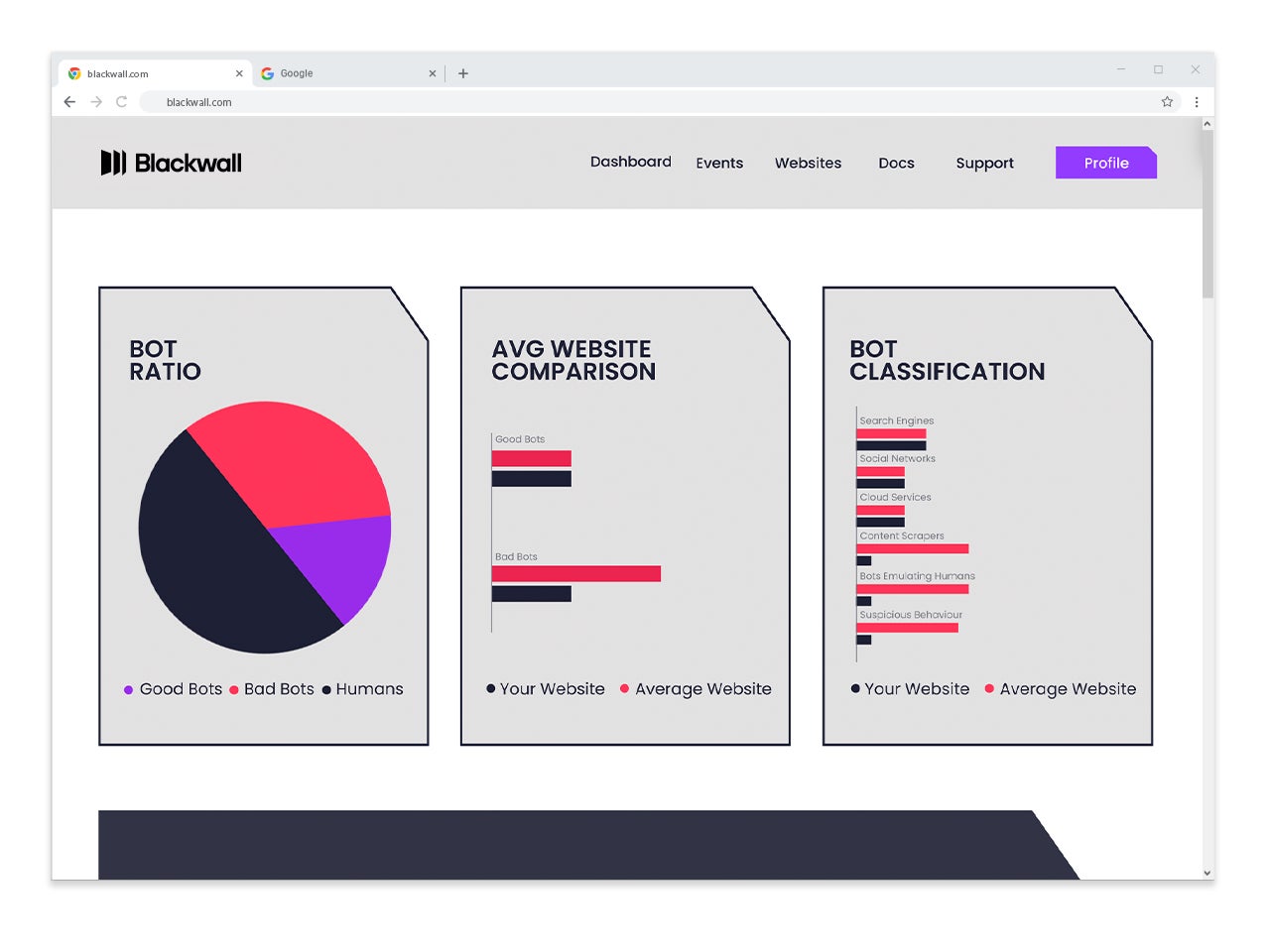 Blackwall社のサービスはBotトラフィックの分析・識別に特化したAIエンジンにより、Good Bot(検索エンジンクローラーなど)とBad Botを自動識別し、Webサイトへのトラフィックを適切に制御します。